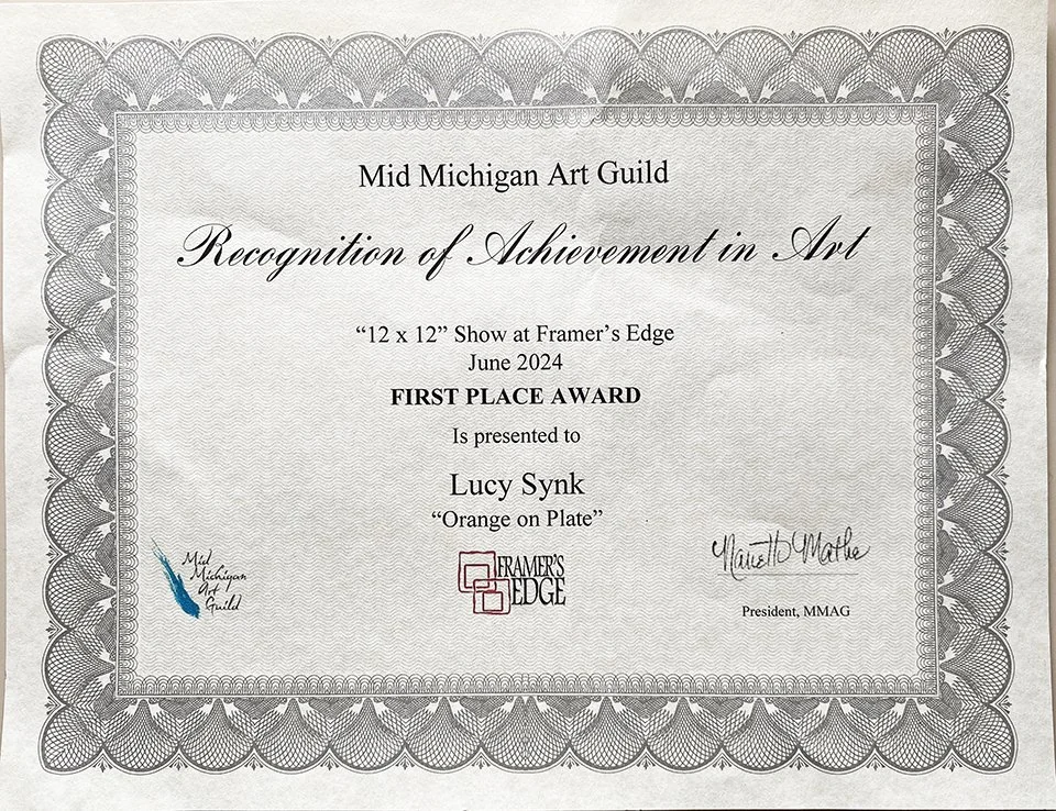 · MMAG 12×12 Show at Framer’s Edge, 2024, 1st place for “Orange on Plate”